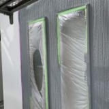 サッシや建物に付帯する設備等に塗料がつかないようにビニールなどで養生します。