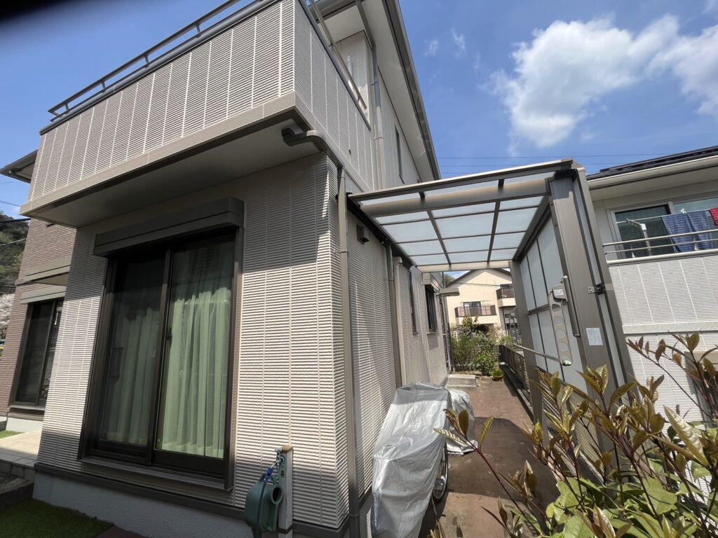 近郊のお家施工中のご挨拶回りのチラシからお問い合わせいただきました。築15年、トヨタホームさんの初めての外壁塗装工事となります。築15年ということもあり、経年劣化に伴うチョーキング現象や、お家全体の色褪せが目立ちました。目地部分もひび割れややせが目立ちました。
