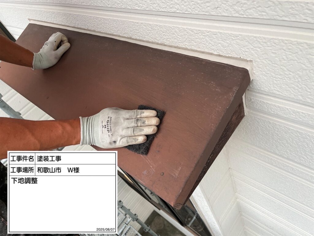 付帯部の劣化部分をペーパー(紙やすり)などを使って素地調整していきます。