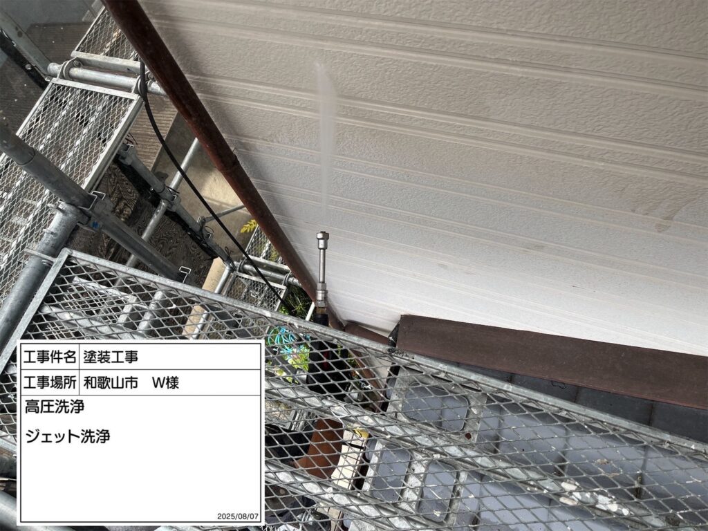 高圧洗浄機を用いて、屋根・外壁・その他付帯部などを洗浄していきます。