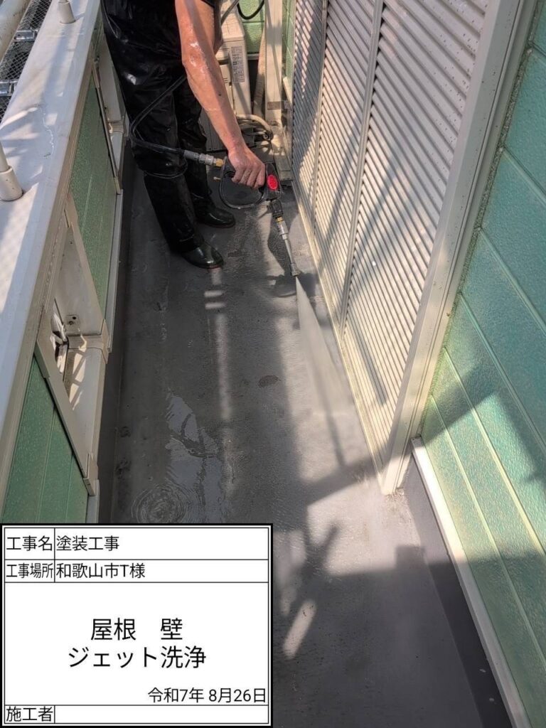 高圧洗浄機を用いて、屋根・外壁・その他付帯部などを洗浄していきます。