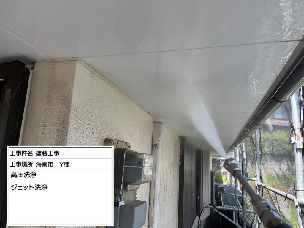 高圧洗浄機を用いて、屋根・外壁・その他付帯部などを洗浄していきます。