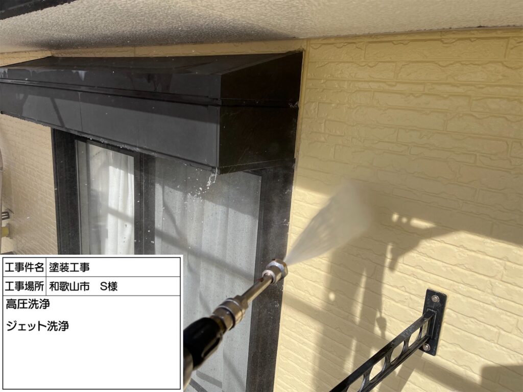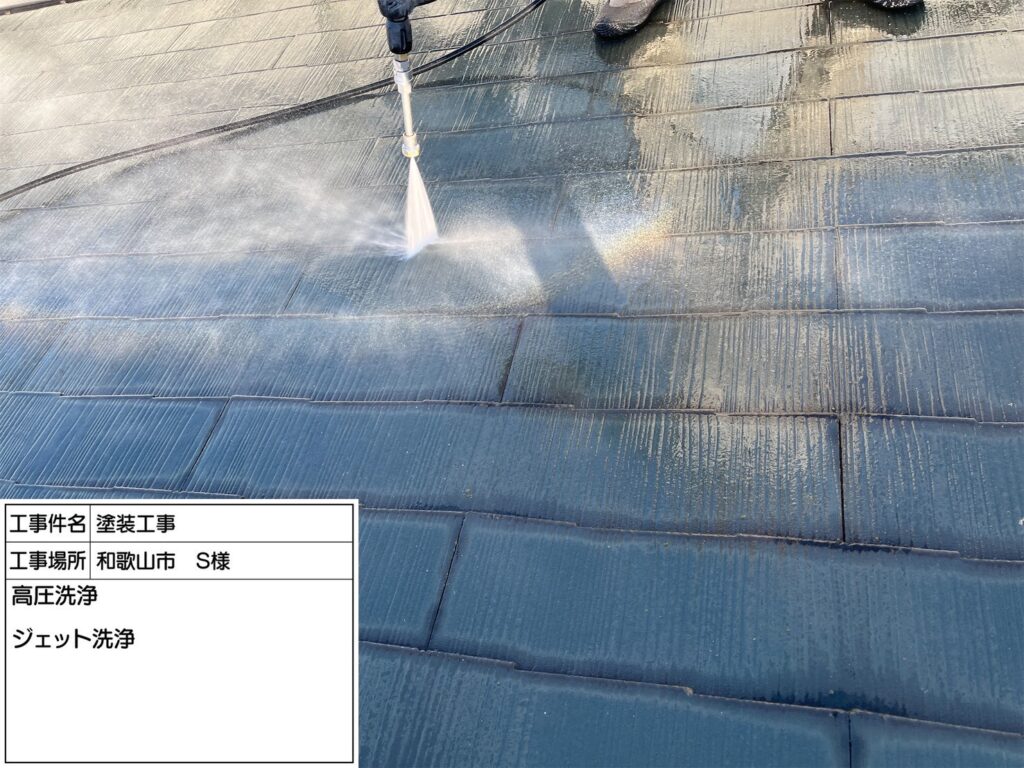 高圧洗浄機を用いて、屋根・外壁・その他付帯部などを洗浄していきます。