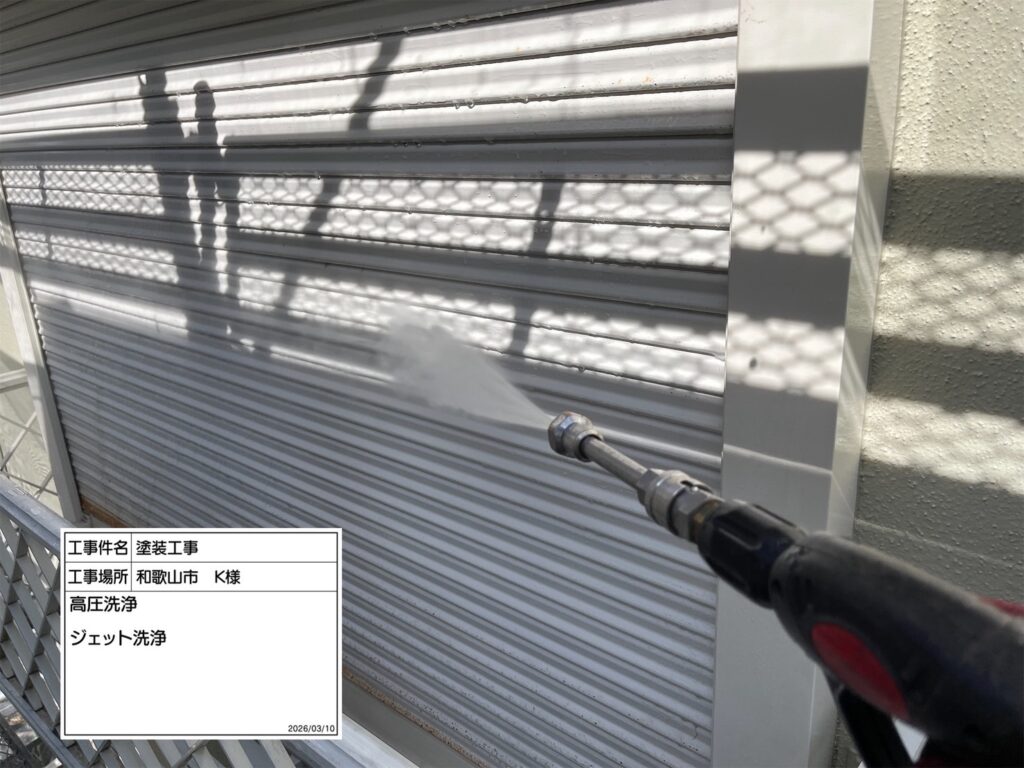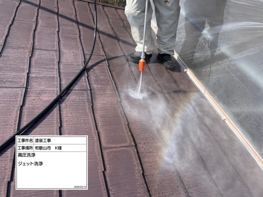 高圧洗浄機を用いて、屋根・外壁・その他付帯部などを洗浄していきます。